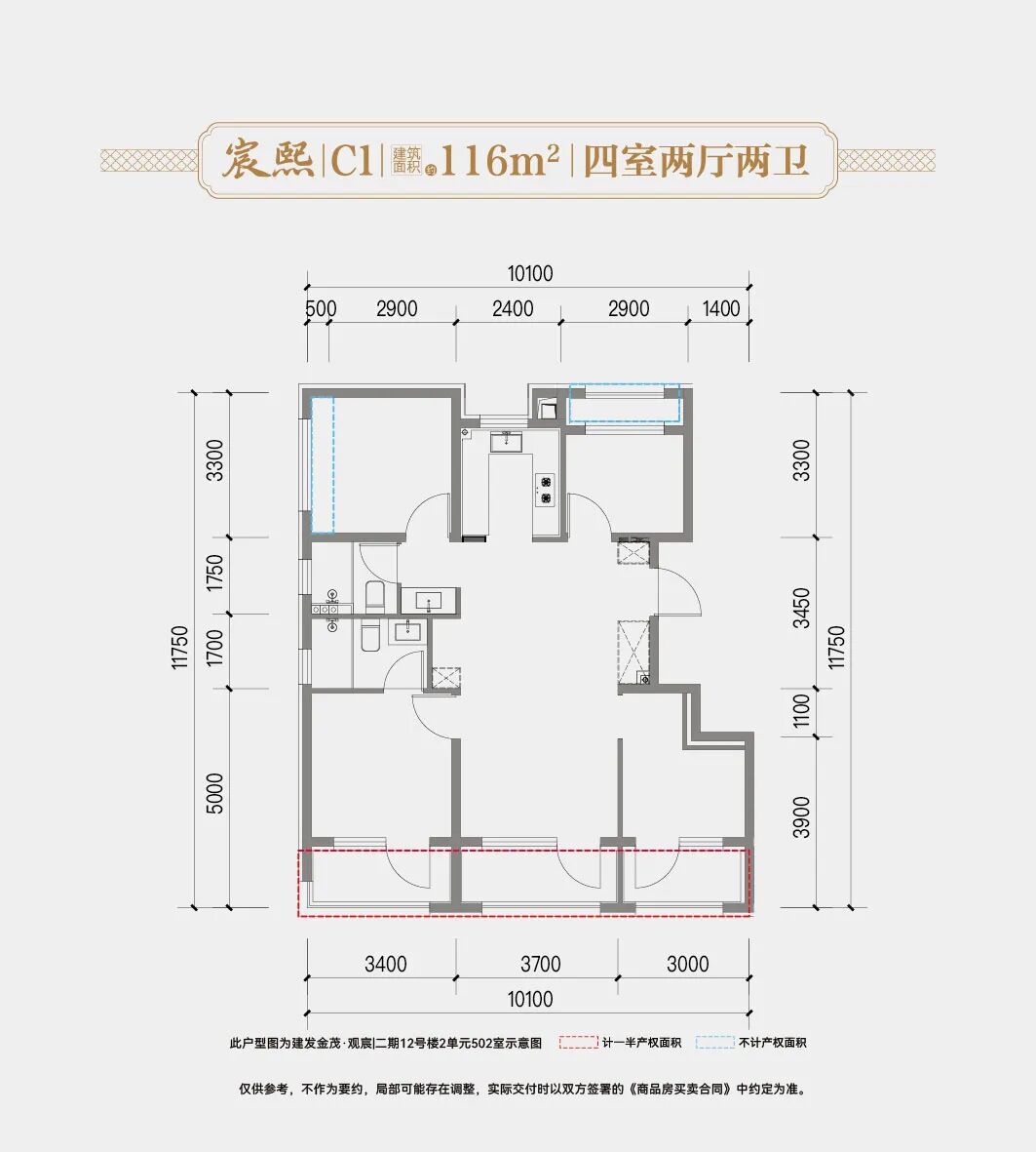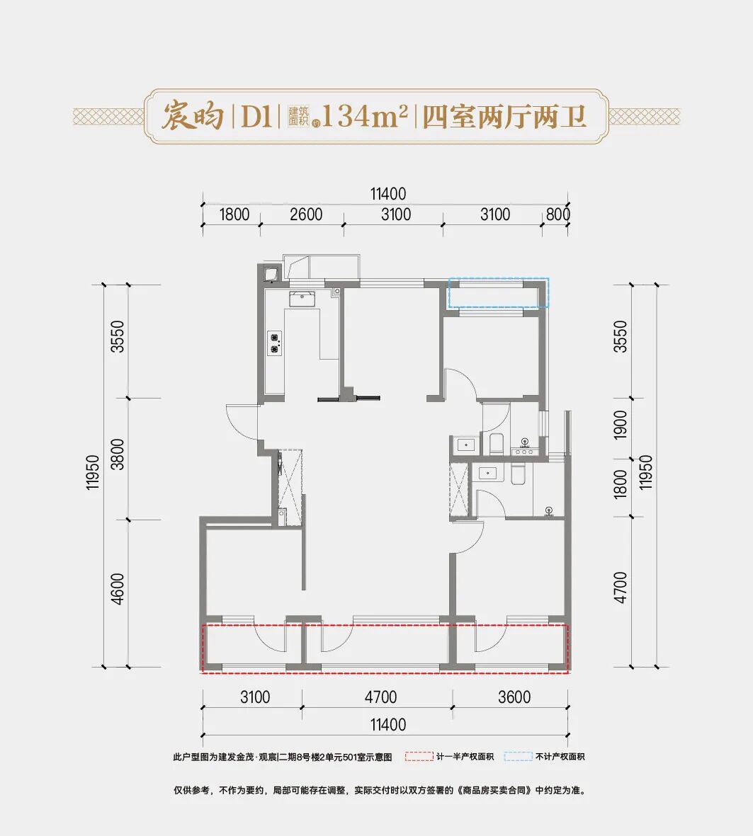 以一期建面约165㎡的户型为例。