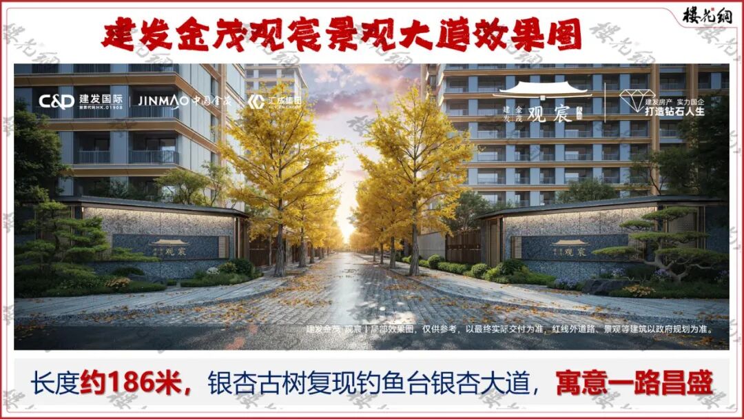 一二期之间的街坊路,将打造成一条景观大道,整体长度达到了约186米,专属景墙中轴对称,酒店式归家仪式感,两旁的银杏古树将复现钓鱼台银杏大道的胜景,寓意一路昌盛。