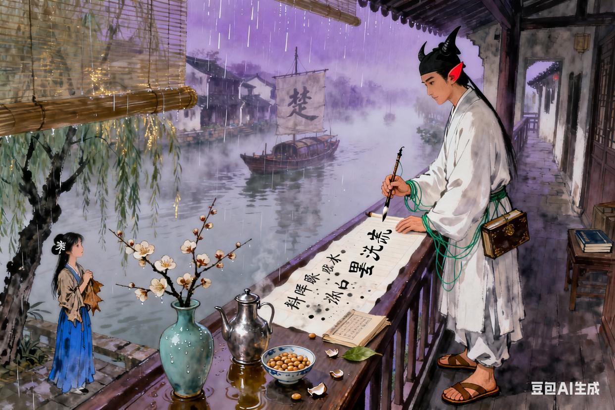 后来他去江南,在苏州的一家客栈住了三个月。那天清晨,他刚推开窗,就见楼下的柳树下,站着个穿蓝布裙的女子,手里攥着块绣帕,望着江面上的船。从日出等到日落,女子的帕子攥得皱巴巴的,也没等来要等的人。温庭筠回到客栈,摸出那支带裂纹的笔,蘸了墨就写。写 “梳洗罢” 时,他想起女子清晨梳妆的模样;写 “独倚望江楼” 时,又想起她靠在柳树上的背影。写到 “斜晖脉脉水悠悠”,墨汁忽然洒在纸上,晕开一小片黑。他没换纸,反倒顺着墨晕添了笔,把 “悠悠” 二字写得更绵长 —— 就像那女子的等,没个尽头。后来这首《望江南》被教坊的乐师拿去谱了曲,唱遍江南时,有人说他写的闺情太艳,他听了只笑,“艳的是脂粉,软的是人心,你没等过,怎会懂?”