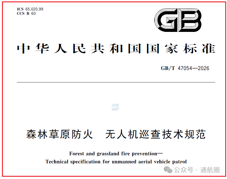 近日,国家标准化管理委员会正式发布《森林草原防火无人机巡查技术规范》(GB/T 47054—2026),明确自2026年5月1日起,这份承载着行业期盼的标准将在全国范围内正式落地施行。该规范由国家林业和草原局牵头擘画,汇聚大疆创新科技有限公司、成都市无人机产业协会及一众科研院所、行业骨干单位的智慧力量联合编制,作为我国首个聚焦森林草原防火无人机巡查领域的国家级标准,它的诞生,精准填补了国内该领域标准化建设的空白,为我国无人机护林防火事业划定了规范航向,标志着无人机在森林草原防火巡查领域的应用,正式从“无序探索”迈入“规范提质”的全新发展阶段。