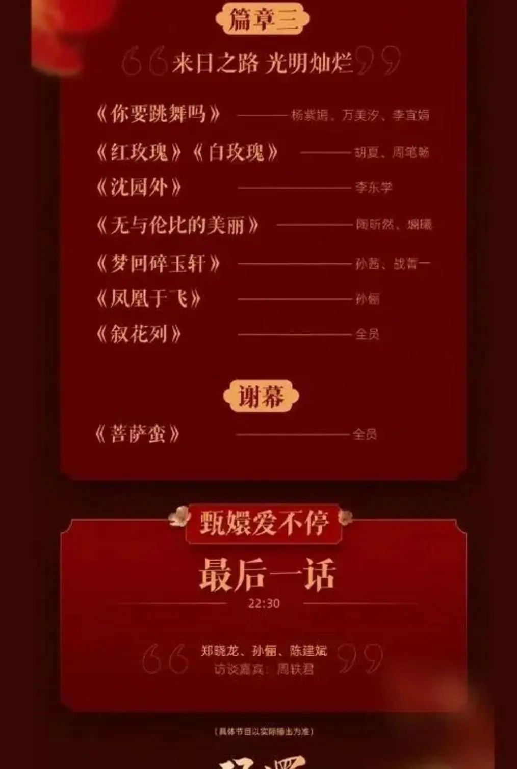 整场晚会形式比较单调,就是演员们轮流唱歌,要是能穿上剧里的服装,氛围肯定更好。但只有几个配角穿了戏服,其他演员都是现代装扮,可能是怕状态不好吧,也可能是经费有限,毕竟重现当年的盛况,成本可不低。