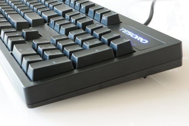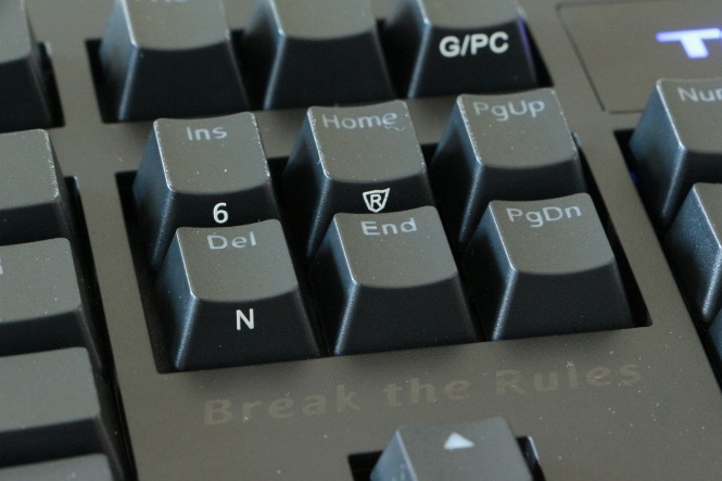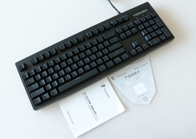 说真的,铁修罗克力博剑cherry机械键盘青轴版仅从外观上,和其他键盘没有太大的差异,104键全尺寸键盘,只在数字小键盘上印刻了个TESORO的英文logo。