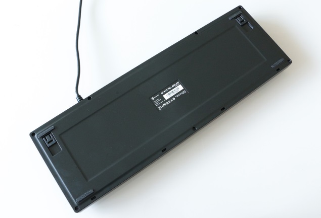 键盘背面和前面一样,依然是黑色色调,其四个角落上,设计了长条形防滑脚垫。并设计了4个泄水孔。
