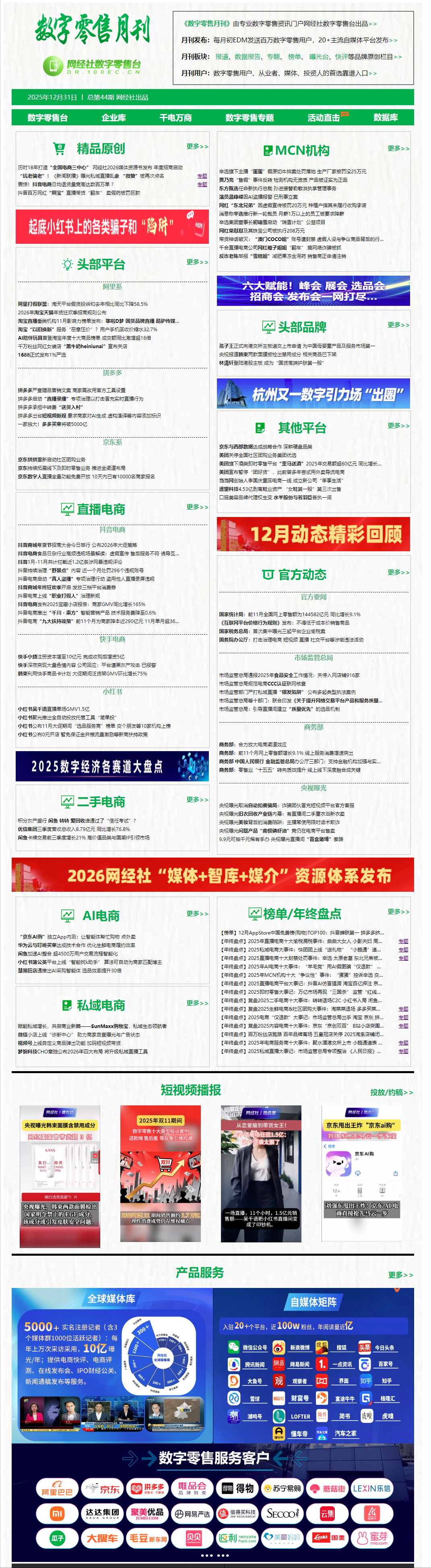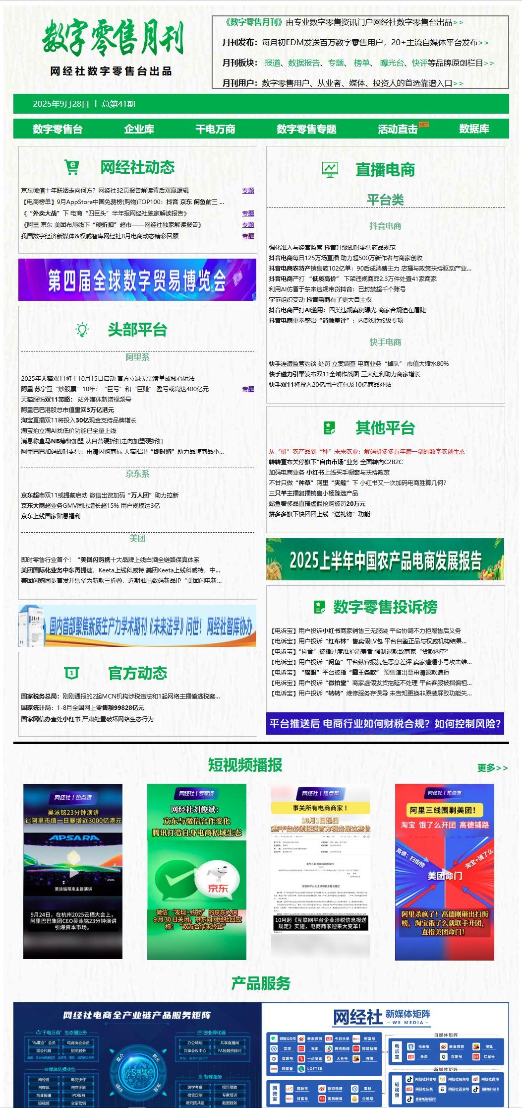 《数字零售月刊》由专业数字零售门户网经社数字零售台出品,面向数字零售从业者的精品内容产品,每月以EDM方式精准发送平台注册高端用户,并在线上长期专题集中展示、备查。
