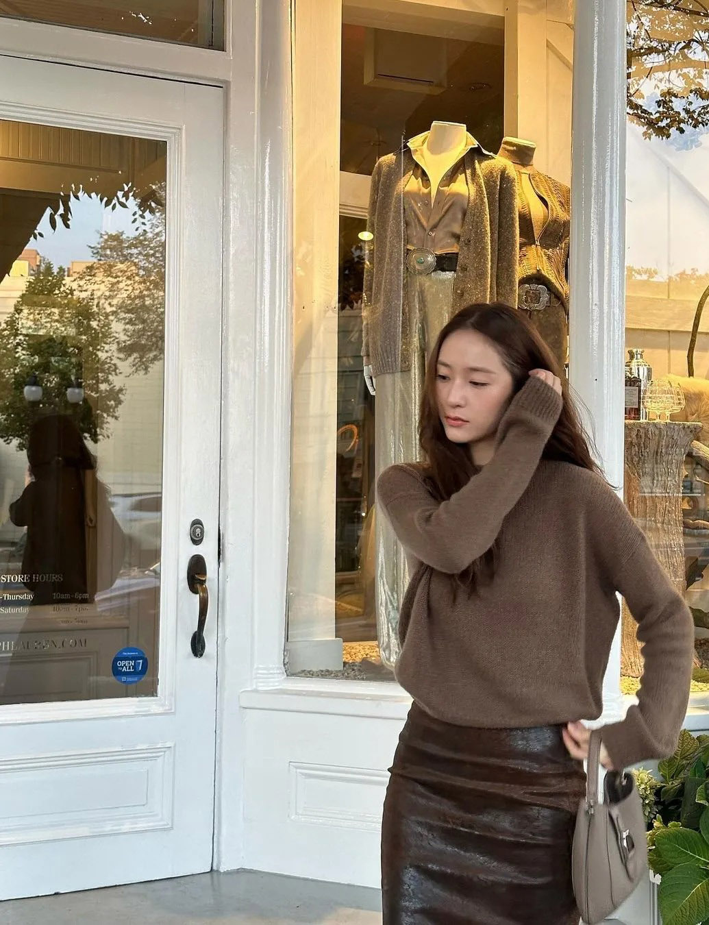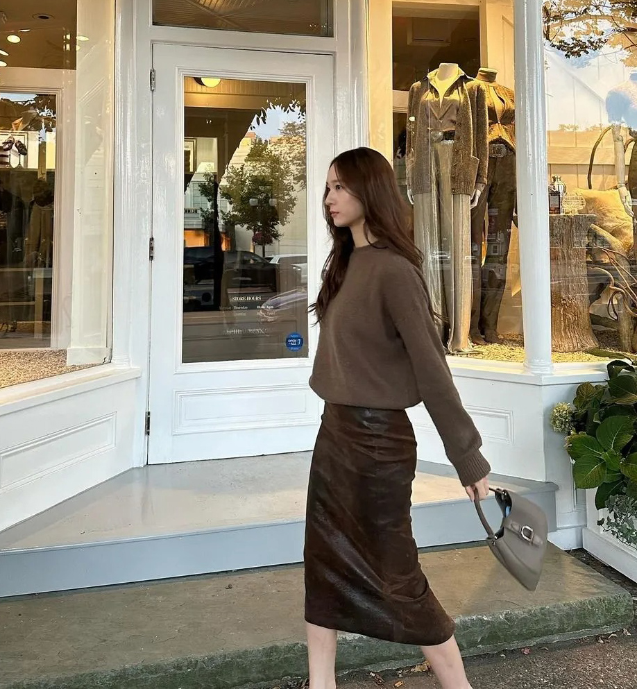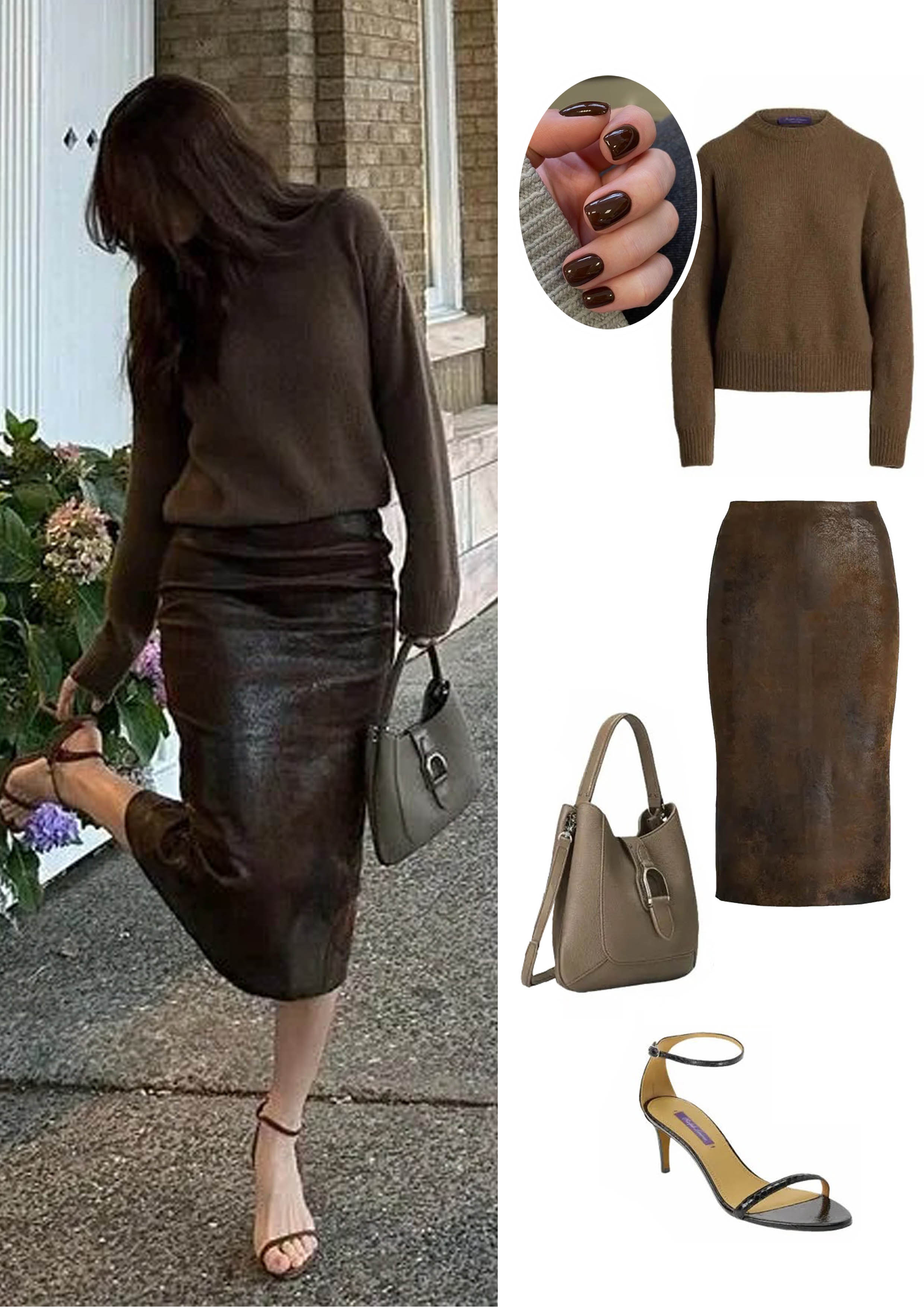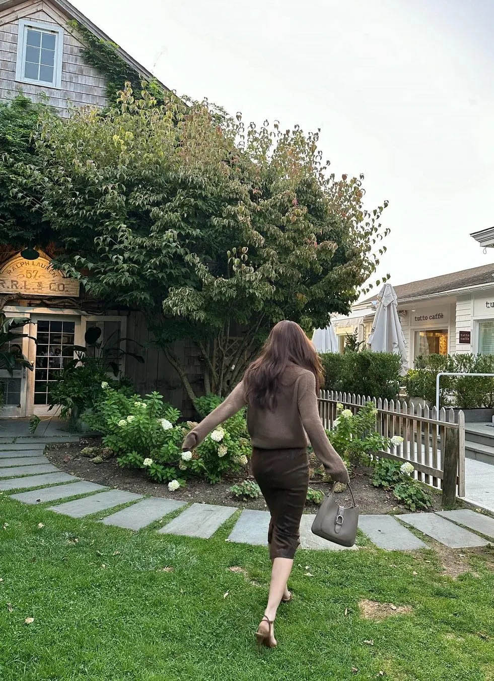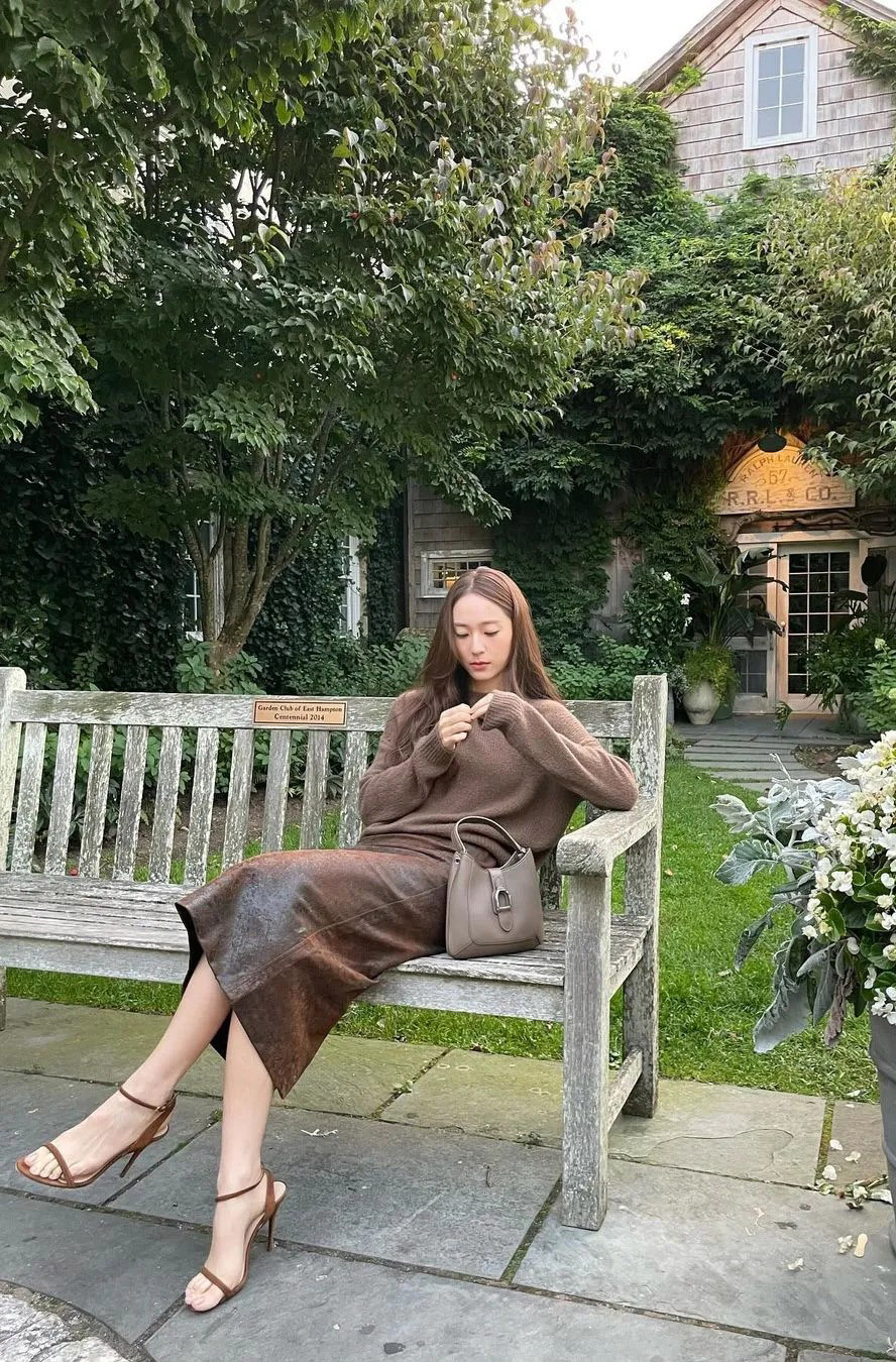 她身穿一件棕色针织上衣,搭配同色系漆皮半身裙,手拎灰棕色皮革手袋,采用一组简约低调的颜色组合,搭配经典的细高跟凉鞋,同色系穿搭,时髦而不张扬,完美全是优雅沉稳好气质,勾勒修长曼妙的曲线。