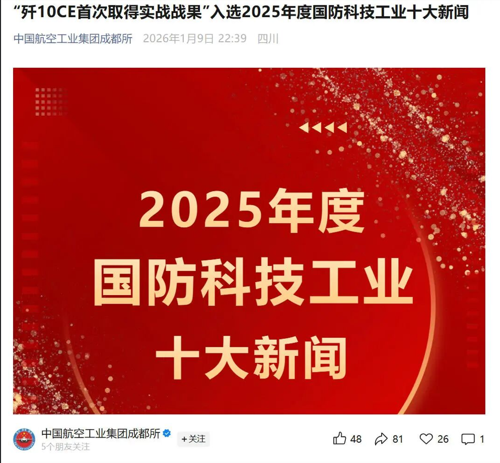 1月9日,国家国防科技工业局新闻宣传办公室发布2025年度国防科技工业十大新闻,其中,歼10CE战斗机因 “首次取得实战战果引发全球关注” 入选,位列第10条。