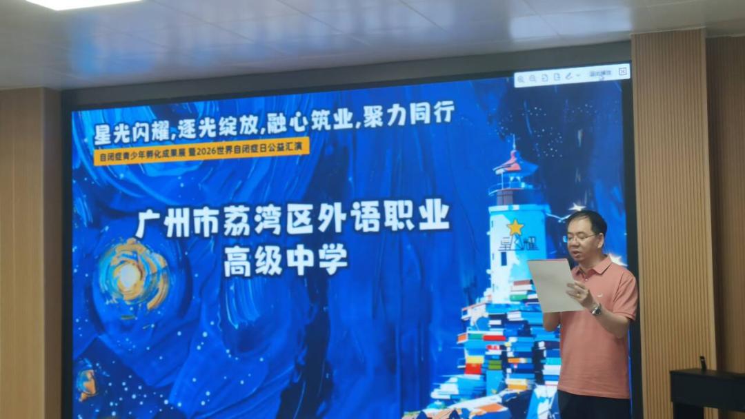 4月2日是第19个世界自闭症日,广州市荔湾区外语职业高级中学联合荔湾区星耀自闭症青少年社会服务中心、华林街公共就业服务综合体主办的“星光闪耀,逐光绽放;融心筑业,聚力同行”自闭症青少年孵化成果展暨2026世界自闭症日公益汇演,在荔湾区华林街道党群服务中心圆满落幕。广州市荔湾区外语职业高级中学白明书记、彭东海副校长亲临现场,与启能部师生、志愿者及社会各界爱心人士齐聚,用陪伴暖心守护“星星的孩子”逐光绽放。