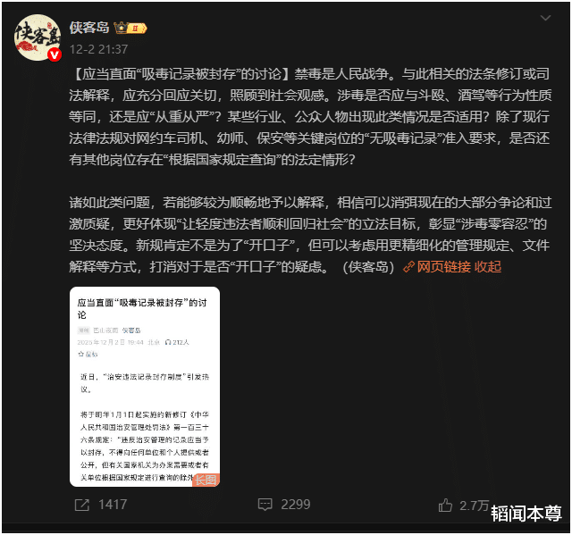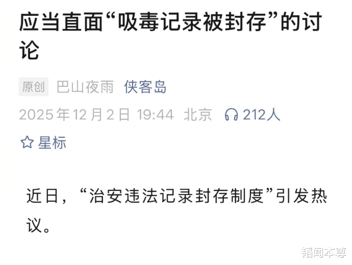 12月2日晚,针对“吸毒行为记录封存”所引发的热议,“侠客岛”发布评论文章《应当直面“吸毒记录被封存”的讨论》,文章指出:禁毒是人民战争。与此相关的法条修订或司法解释,应充分回应关切,照顾到社会观感。涉毒是否应与斗殴、酒驾等行为性质等同,还是应“从重从严”?