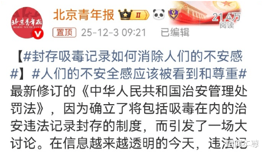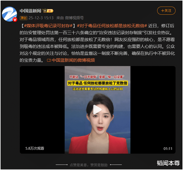 12月3日下午3时13分,“中国蓝新闻”发文,强调“对于毒品任何放松都是放松无数倍”,文中指出:对于毒品领域而言,任何放松都是放松了无数倍!网友反应强烈的核心,是不愿看到吸毒的违法成本被降低。法治进步既需要专业的构建,也需要人心的认同。公众对这个规定的关注与讨论,恰恰是监督这一制度不断完善、确保在执行中不被异化的宝贵力量。