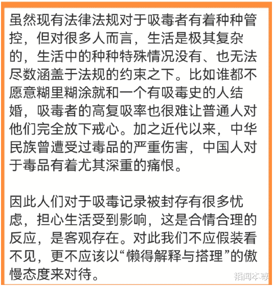 比如“界面新闻”发布评论文章《吸毒等治安违法记录封存非纵容,是现代法治的“容错与救赎”》。