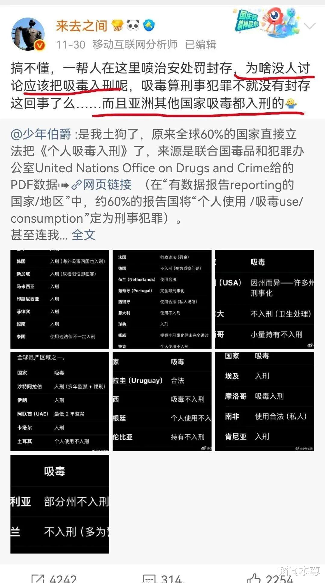 微博CEO 发文指亚洲其它国家都吸毒入刑的。