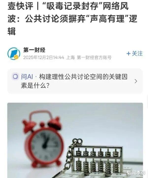 比如“第一财经”发布了评论文章《“吸毒记录封存”网络风波:公共讨论须摒弃“声高有理”逻辑》。