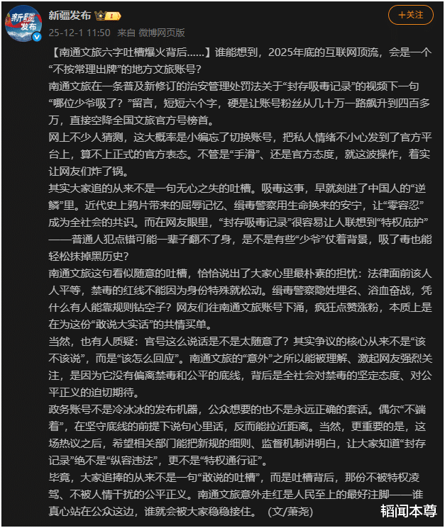 12月1日,“新疆发布”发布了评论文章《南通文旅六字吐槽爆火背后》。