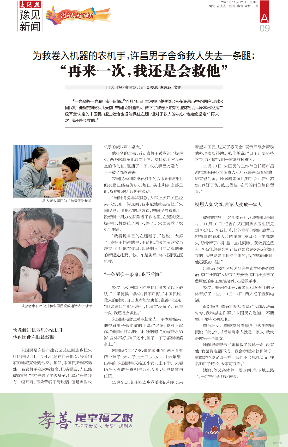 2025年11月2日,宋国民用自己的一条腿,救下了被卷入旋耕机的农机手。原本已经是二级耳聋认定的宋国民,经过救治也没能保住左腿,但对于救人的决心,他始终坚定:“一条腿换一条命,我不后悔,再来一次,我还是会救他。”害怕来自本能,但救人的心却无比坚定。