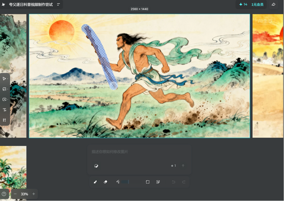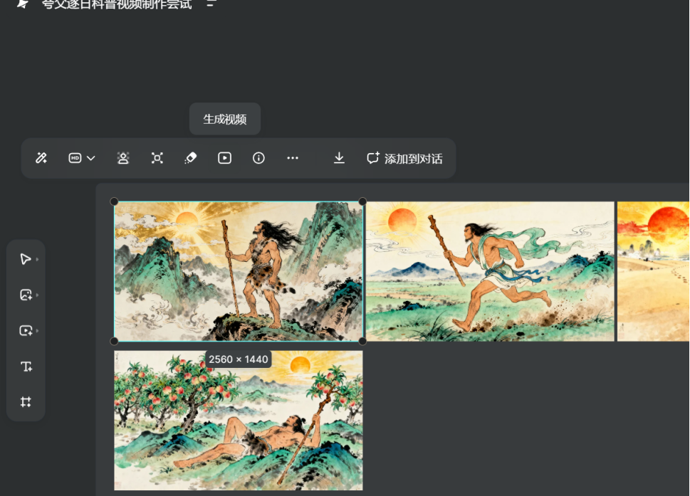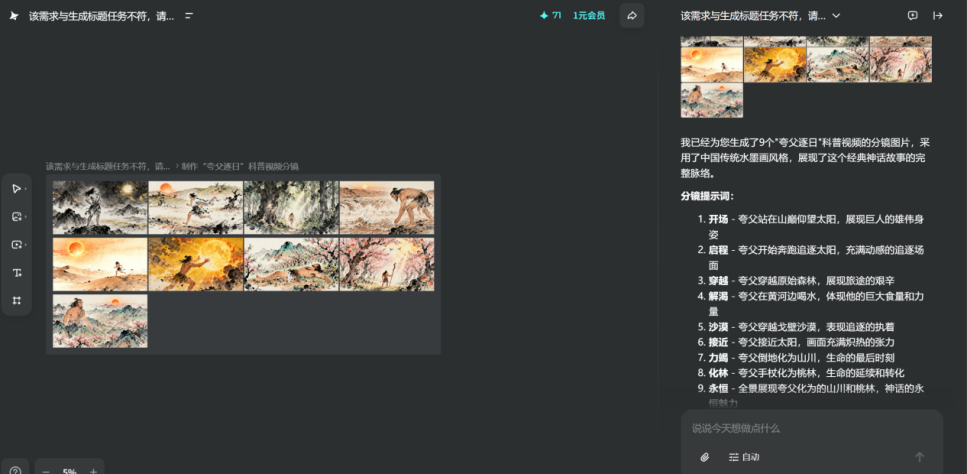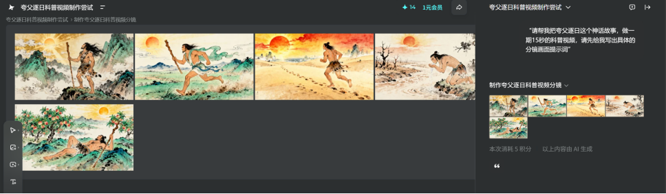 输入"夸父逐日"后,即梦AI在3分钟内生成了9张风格统一的古风分镜图