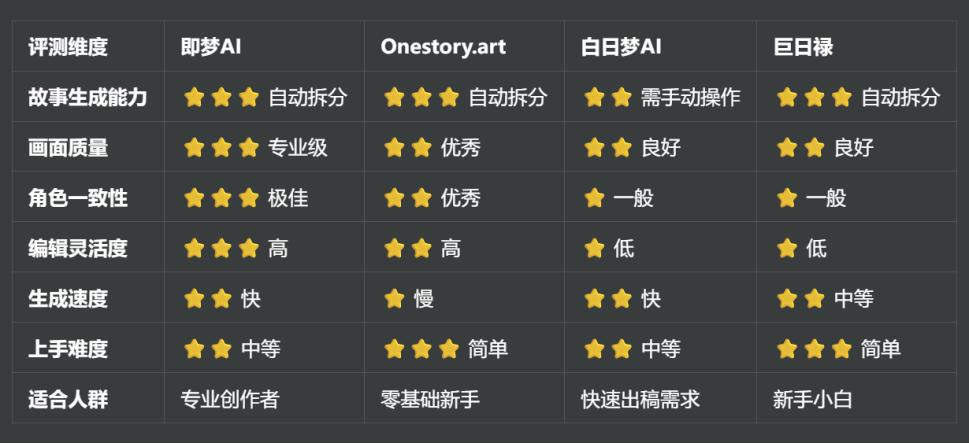 我通过对即梦AI、Onestory.art、白日梦AI、巨日禄四款主流工具的系统测评,为广大创作者提供客观的选择参考