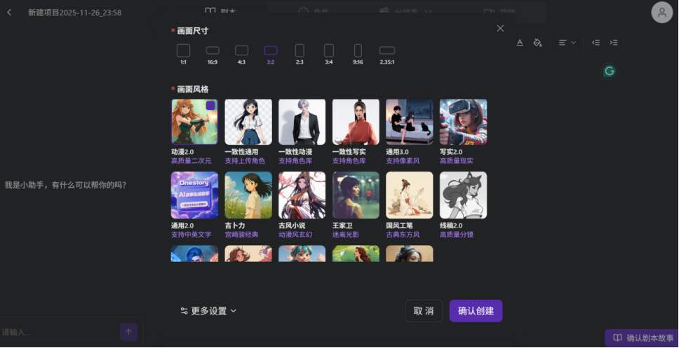 进入工作台,选择画面尺寸和风格,输入完整故事,Onestory.art会自动分析文本、生成角色、拆解分镜。整个过程非常省心,AI会根据故事内容推理出需要多少个镜头、每个镜头拍什么