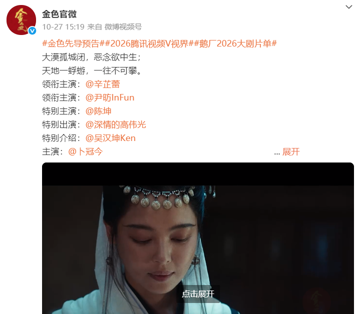 这部改编自古龙小说《大地飞鹰》的新剧,由《红色》编剧徐兵执导,主演阵容堪称梦幻,辛芷蕾挑大梁,陈坤、高伟光、尹昉、吴汉坤齐聚助阵。