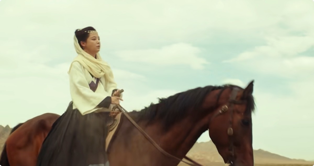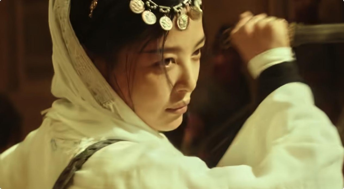 她的造型惊艳,一身异域白袍,披发迎风,肩上挂着风沙、眼中藏着杀意。