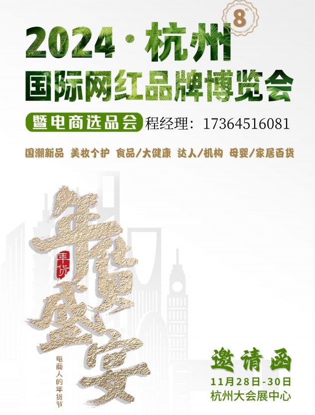 2024第八届杭州国际网红品牌博览会暨电商选品会将于2024年11月28日-30日在杭州大会展中心举办。杭州网红直播展是国内首家将主播直播带货带入展览现场的展会,也是聚品牌MCN、KOL、社群团购、主播行业的贸易盛会,也是众多业界人士开拓市场的之选,整合杭州优质的电商新渠道资源,打造直播电商生态圈,助力企业开拓全渠道营销。
