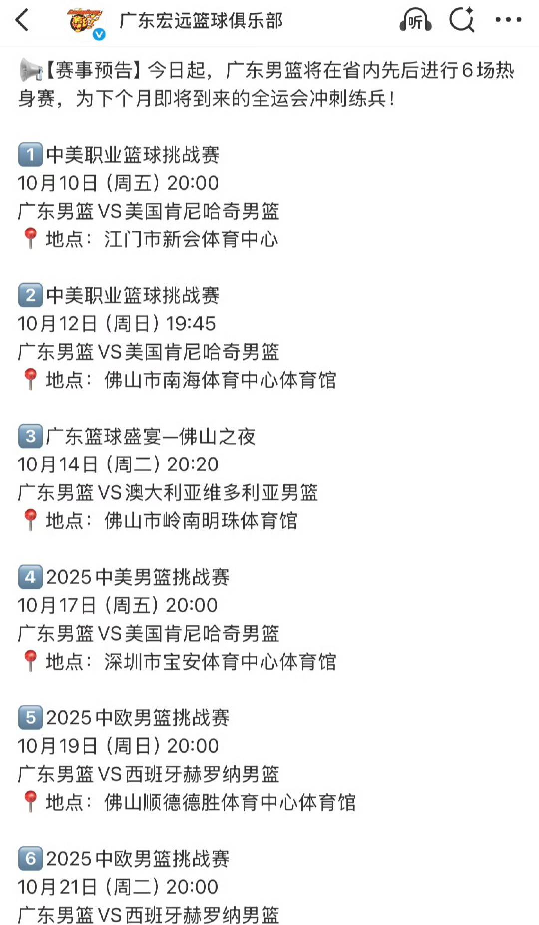 而广东男篮近期也有一系列的热身赛,包括10月14号 佛山禅城站,10月17号 深圳宝安站,10月19号 佛山顺德站和10月21号 深圳龙华站。沈梓捷目前正在跟随北控男篮军训,相信用不了多长时间就会归队。