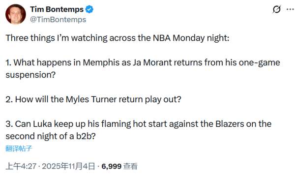 北京时间11月4日,新赛季NBA常规赛继续进行。根据名记Shams等人的报道,多支球队都在关注莫兰特在灰熊队的情况,不过他的交易前景并不理想,名记Tim Bontemps甚至直言莫兰特还不如加兰。