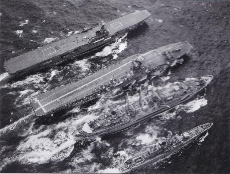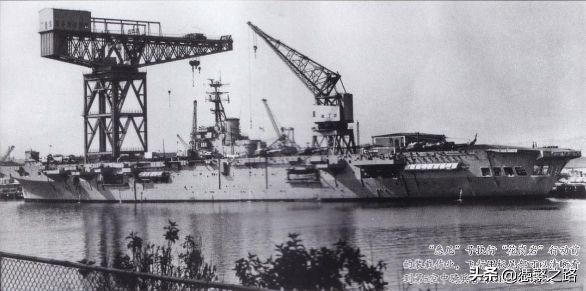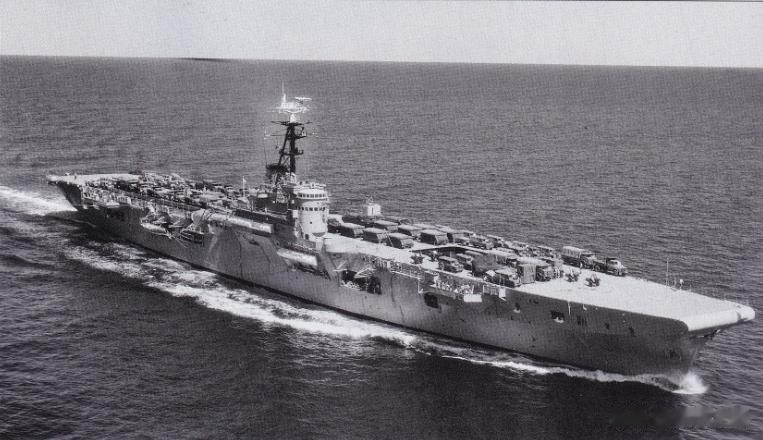 图示:澳大利亚航母编队航拍照片:外侧是已改装成运输舰的“悉尼”号;当中是已改装“海雌狐”喷气式舰载机的“墨尔本”号航母;再里面是AO195补给舰;最下面是“亚拉”号护航驱逐舰。