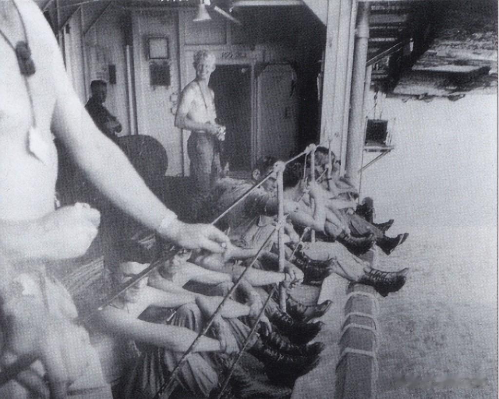 “悉尼”号改装成运输舰后内部拥挤不堪,吊床林立,澳军士兵到舷侧甲板才能透口气。