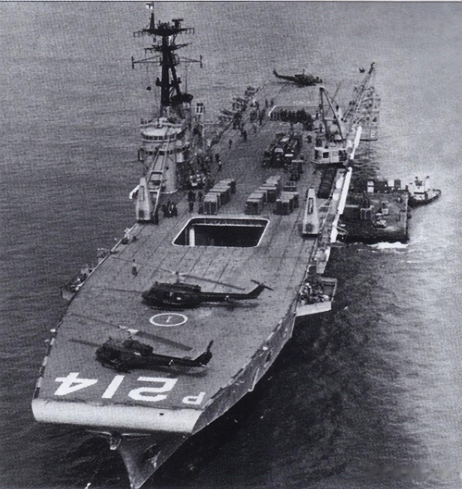 “悉尼”号执行“花岗岩”行动前的装载作业,飞行甲板尾部可以清晰看到第5空中骑兵营的UH-1直升机。