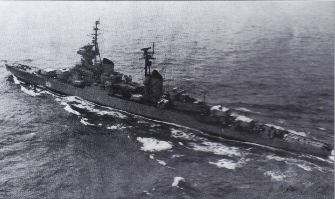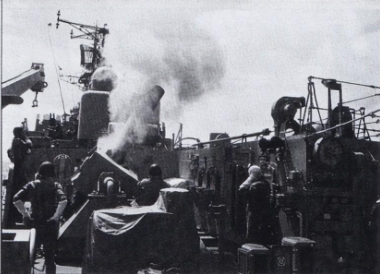 发现潜艇的“帕拉玛塔”号护航驱逐舰,后部装有巨大的反潜深弹发射炮。