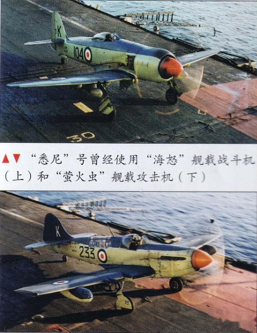“悉尼”号最多载机38架,但一般情况下仅搭载12架“海怒”战斗机、12架用于反潜的“萤火虫”攻击机和2架“海水獭”水陆两栖救援飞机,当然这些都是螺旋桨式飞机。