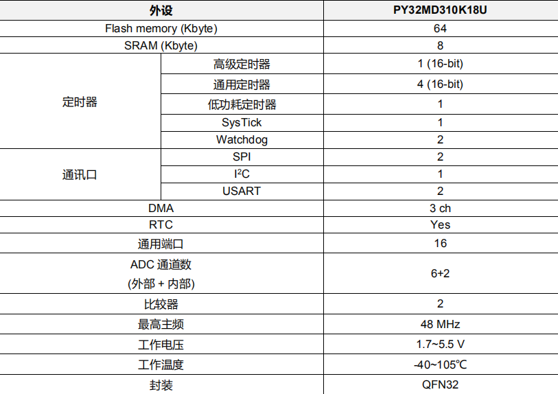 PY32MD310是一款基于ARM Cortex-M0+内核的高性能32位MCU,主要面向主要面向三相/单相无刷直流电机(BLDC)和永磁同步电机(PMSM) 的控制领域。芯片嵌入高达 64 KB Flash 和 8 KB SRAM 存储器,最高工作频率 48 MHz。芯片工作温度范围为 -40℃ ~ 105℃,工作电压范围 1.7 V ~ 5.5 V。