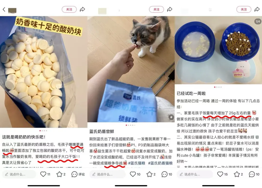 在社交平台上有不少消费者的“自来水”,进一步印证产品竞争力:适口性方面,许多用户提到“猫咪主动进食意愿强”,尤其幼猫对酸奶冻干接受度高,有效缓解“幼猫进食难”痛点;营养层面,不少消费者反馈喂食1-2周后,猫咪粪便状态更稳定、毛发顺滑度明显提升。