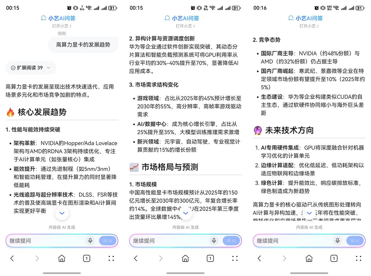 平时工作上遇到不懂的问题,我基本也靠华为浏览器AI问答。上个月客户突然聊起固态电池对新能源车的影响,我当场卡了壳,回去路上就立马打开华为浏览器,勾选“AI问答-深度思考”查了一波最新行业动态,并针对这些内容各种提问恶补,华为浏览器给出的答案直接从国家政策到技术发展再到市场分析,呈现得非常有条理,结构化的答案汇总来源于可信的信源,比我自己上网瞎搜强多了。还有一次想查高算力显卡的发展趋势,用华为浏览器AI问答分分钟搞清楚来龙去脉,第二天和客户交谈更有底气。