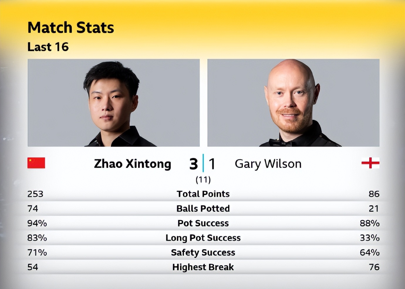 那场比赛,“小钢炮”开场1-5落后的情况下送出5连鞭,6-2爆冷晋级。而在赵心童与加里-威尔逊的这场比赛中,他在开场后0-1落后,随后连扳三局,3-1反超威尔逊。接下来的比赛中,期待赵心童的晋级消息!