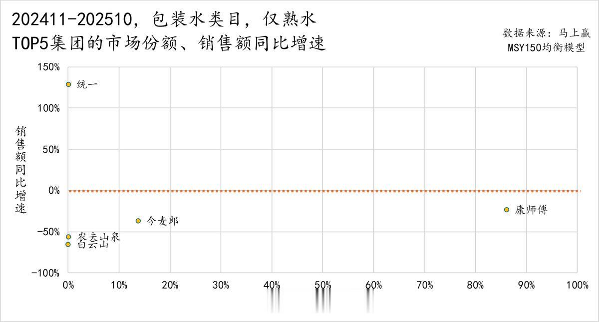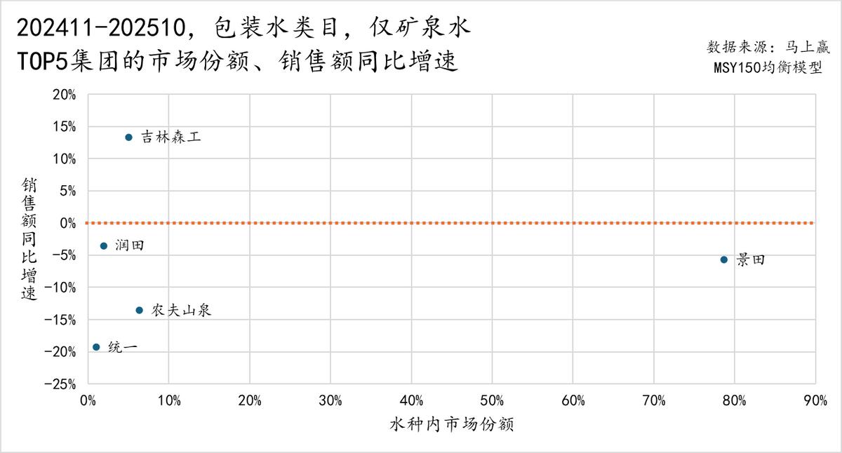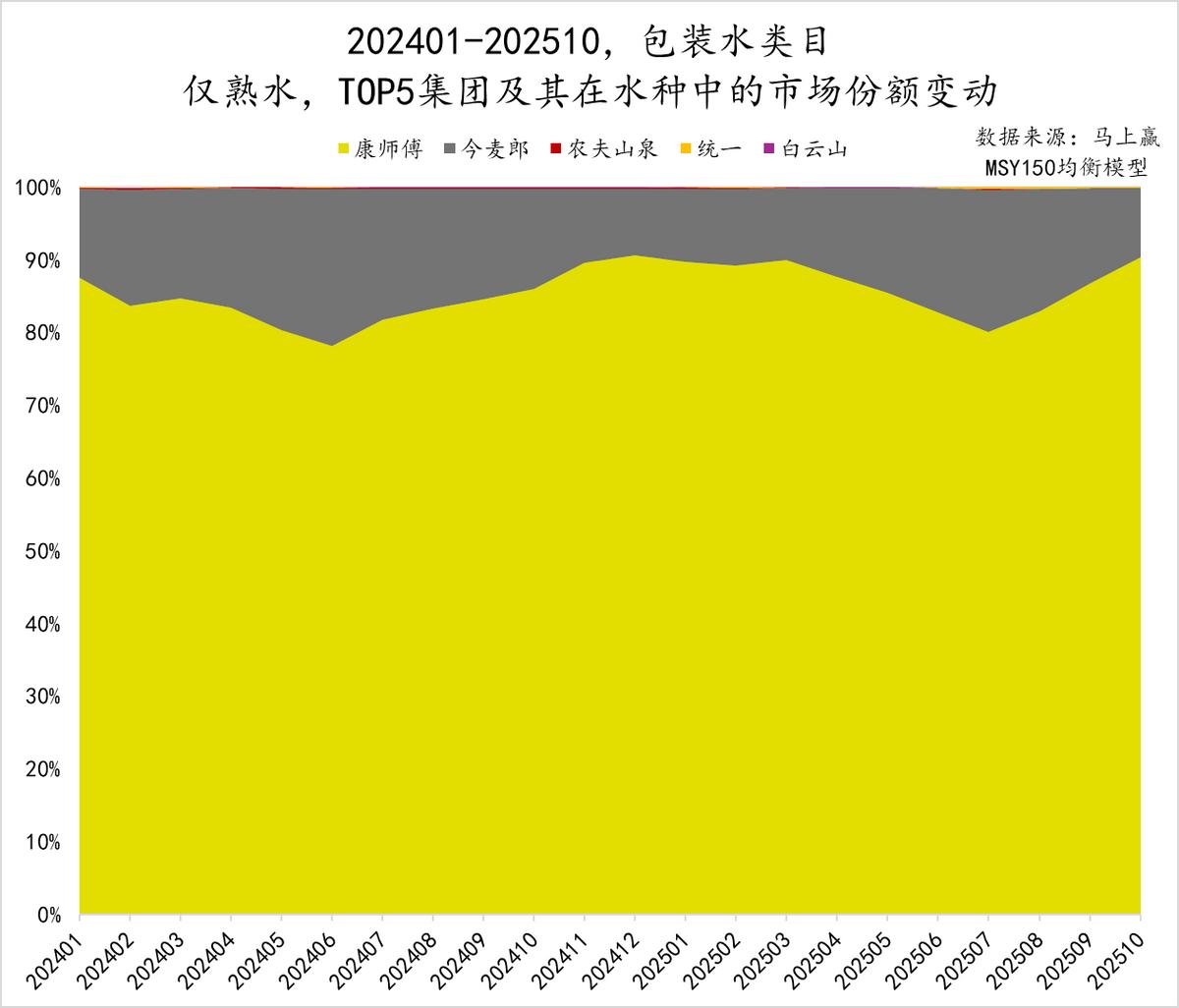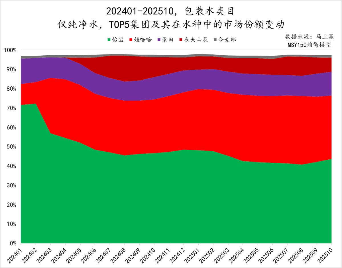 在纯净水水种中,怡宝的市场份额已经从2024年年初高点时的70%+,下滑至2025年8月的低点约40%,在该水种内的市场份额跌去了快一半,下行显著。与此对应的是娃哈哈的显著增长,以及后来加入纯净水水种的农夫山泉。值得注意的是,农夫山泉在纯净水水种中的市场份额高点出现在2024年7、8月,在2025年,其市场份额也有一定程度上的同比下滑。