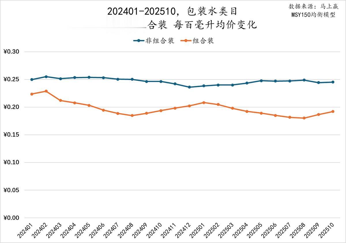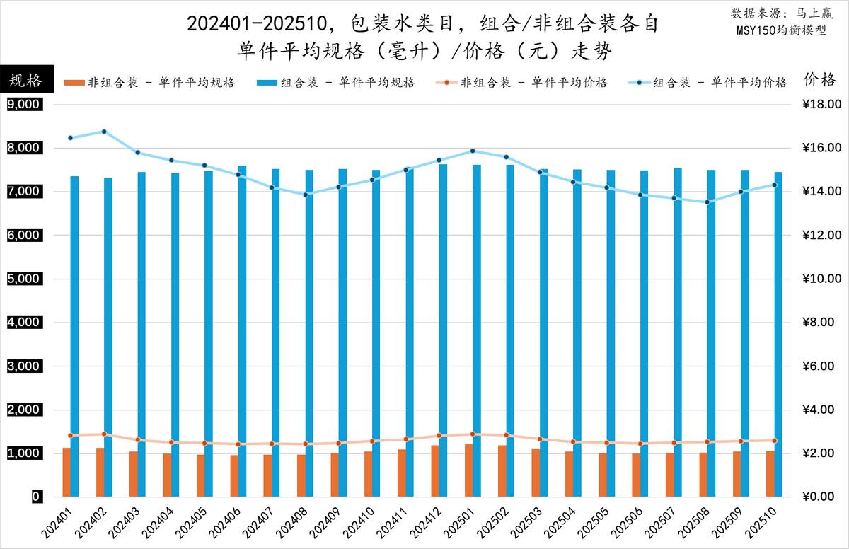 从2024年到2025年,包装水组合装和非组合装的每件平均规格在整体饮料类目大包装化的背景下保持相对稳定,并未显著增长。目前非组合装包装水的平均规格已达到1000ml/pcs,已经大幅高于饮料的单件平均规格。相比来说,组合装产品的规格在7000ml~8000ml之间波动,波动幅度稍大于非组合装产品。