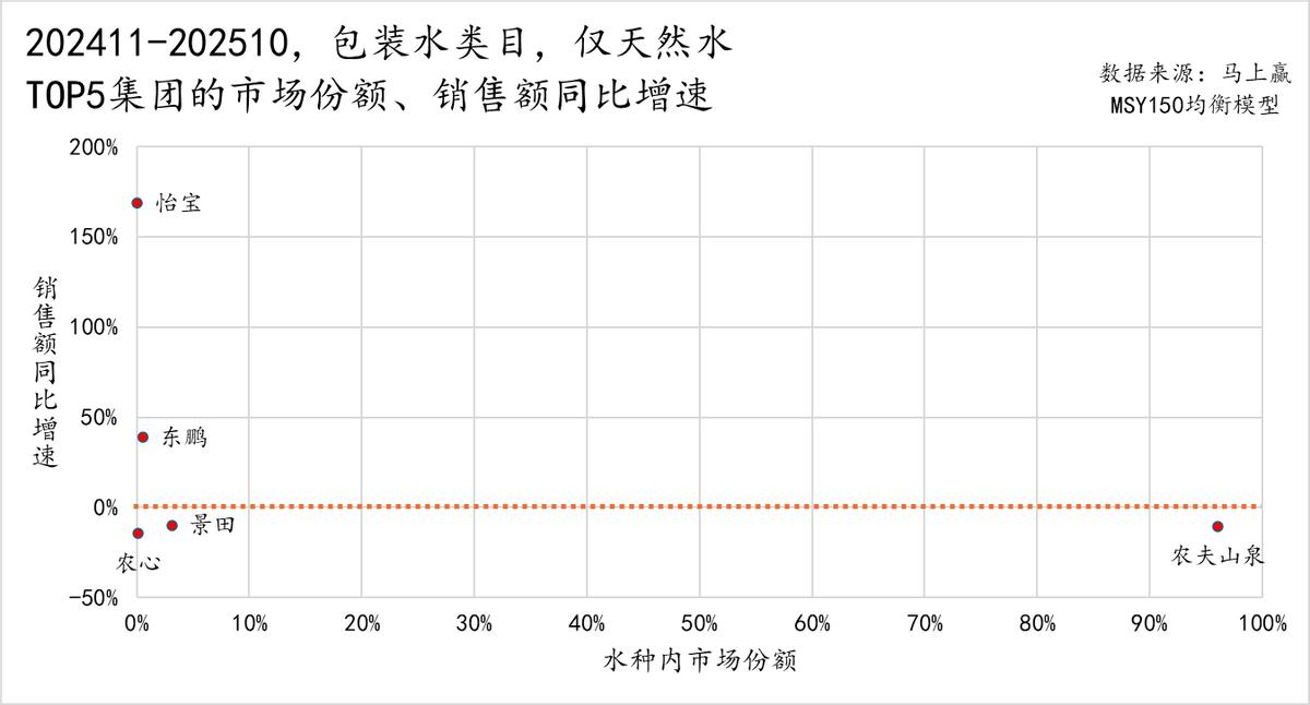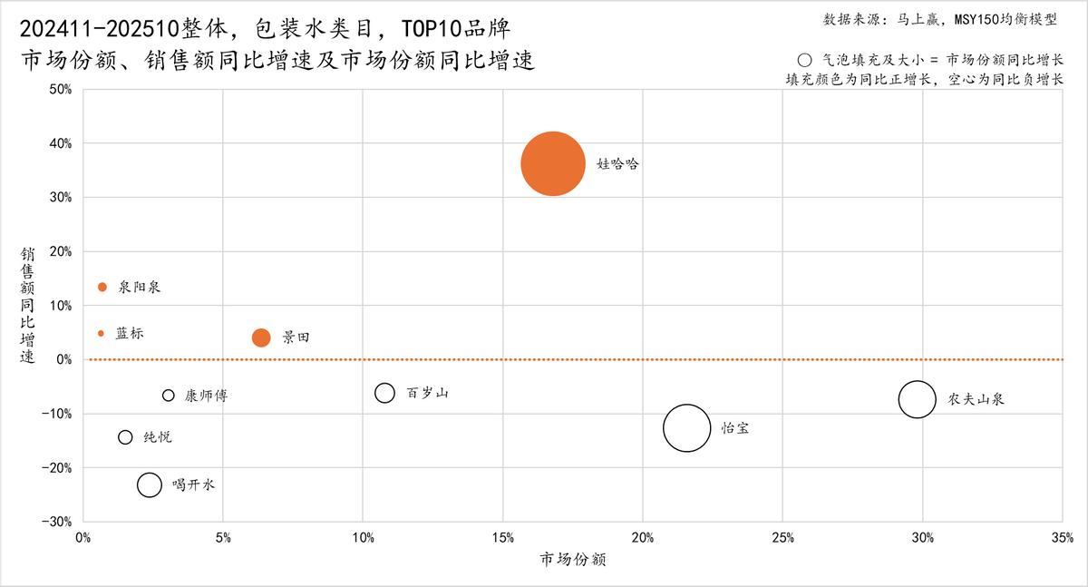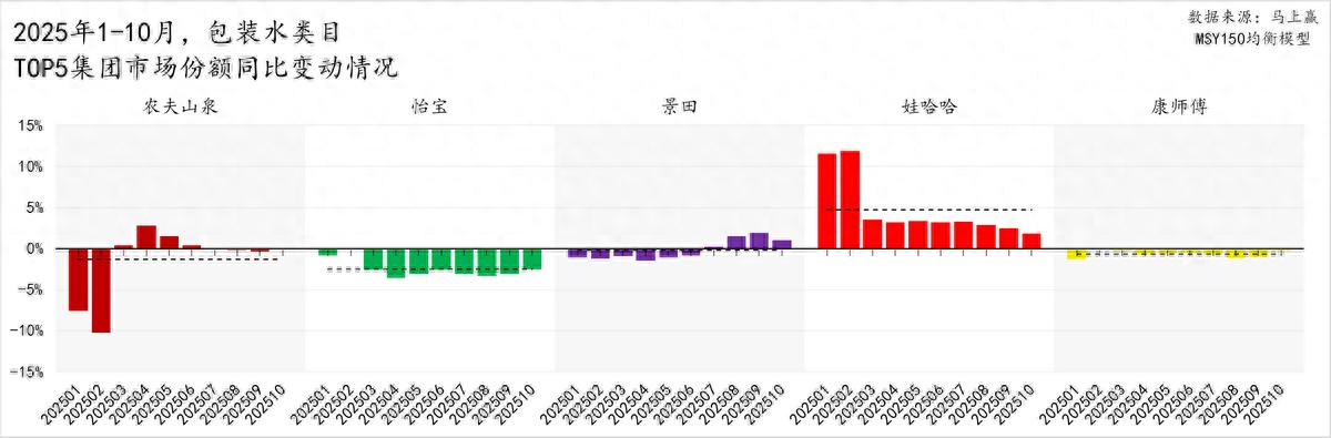 相比来说,长期位于包装水类目中份额第二集团的怡宝,则成为了真正受伤的“角色”。基于1-10月市场份额同比变动来看,没有卷入任何争端的怡宝,自2025年3月起,市场份额始处于约3%的同比下滑状态中。
