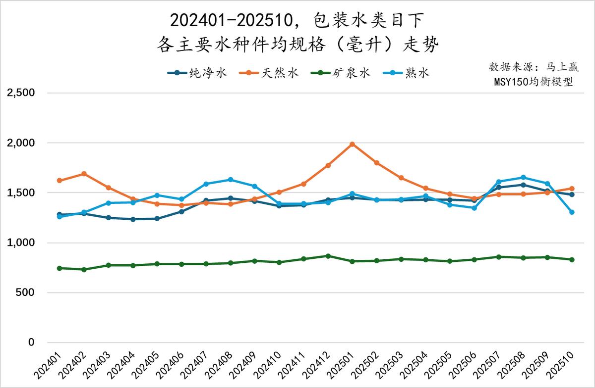 在不区分组合装/非组合装,不同水种的件平均规格上,矿泉水的平均规格始终显著低于其他三种水类,但呈现轻微的上行趋势,从2024年初的约750毫升,逐步上升到约850毫升。虽然矿泉水的规格相对较小,但这一增长趋势表明,随着市场需求的变化和消费者偏好的调整,矿泉水在规格上也在逐步适应市场的变化。