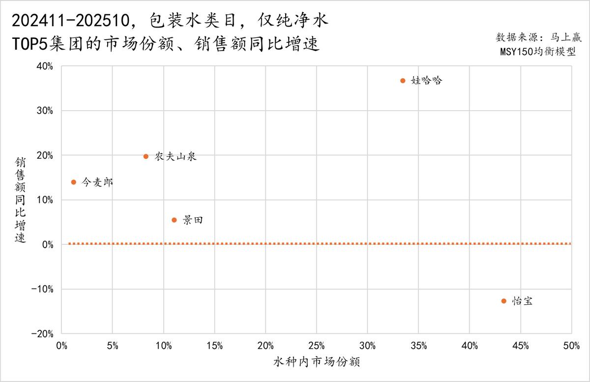 从2025年1-10月,包装水类目TOP5集团的市场变动来看,娃哈哈虽然增长势头已经放缓,但也守住了新夺下的“阵地”;农夫山泉虽然在去年刚刚被卷入漩涡时略显慌乱,但也靠着进军纯净水赛道的“绿水”产品,稳住了阵脚;景田、康师傅各有各的天地,虽然也受到了类目竞争加剧带来的影响,但整体还算平稳。