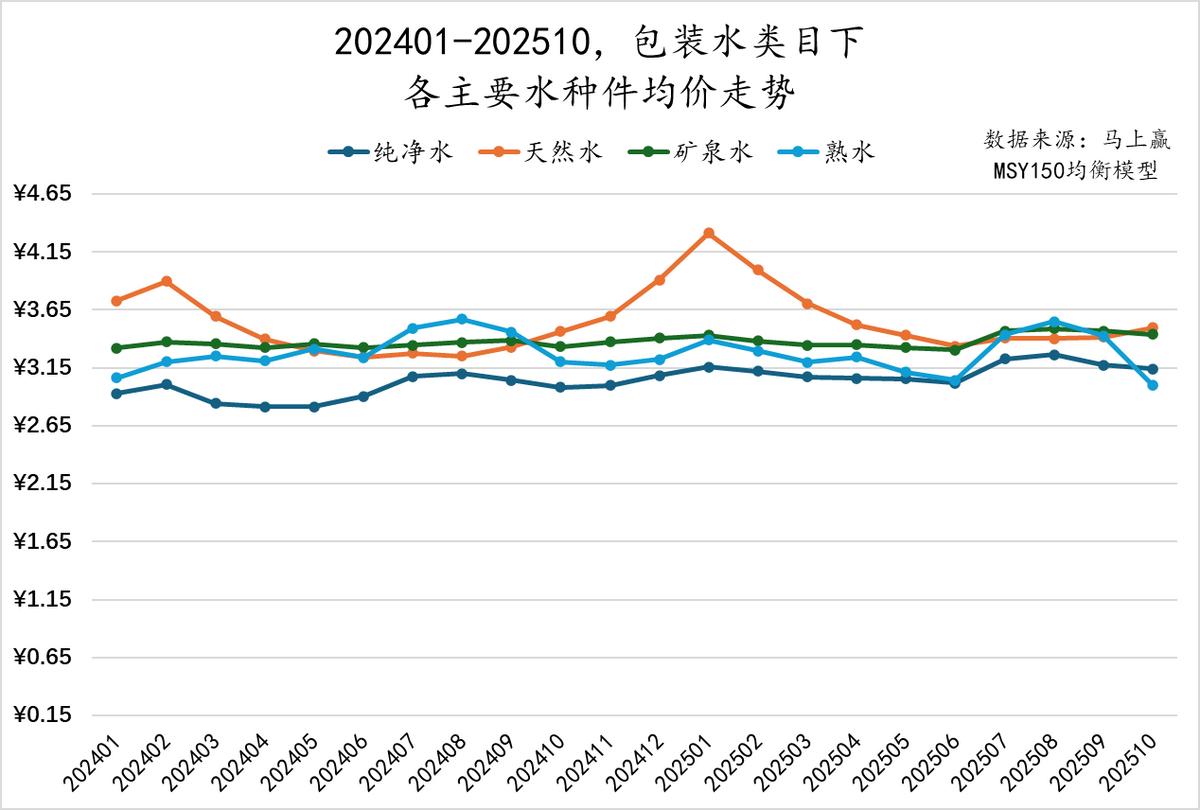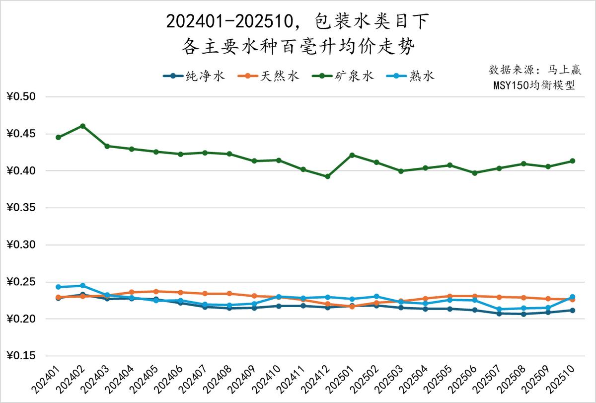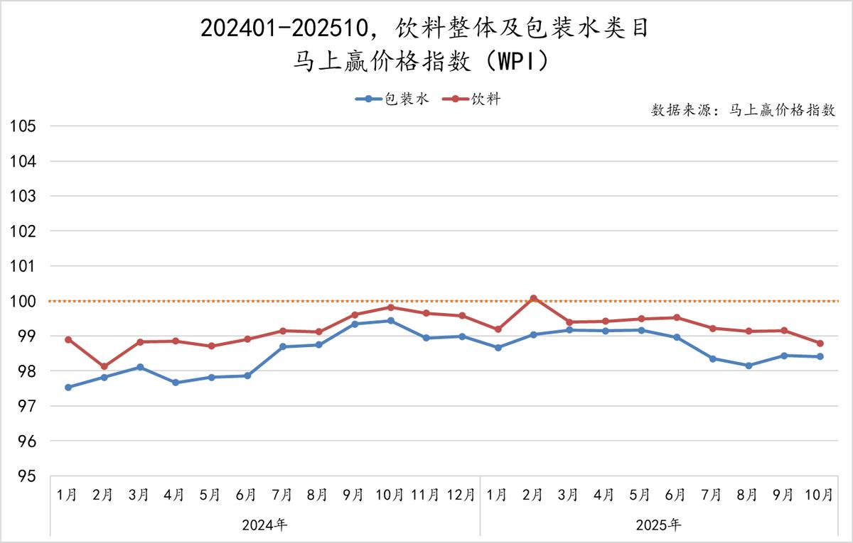 从202401到202510,包装水的WPI始终低于100,表明其价格水平呈同比下降趋势。与整体饮料类目相比,包装水的价格下行压力更为明显。具体来看,2025年上半年,包装水的价格指数相对更接近100,价格下行幅度有所收窄。然而,进入2025年夏季饮料旺季后,价格压力再次显著上升,尤其是在6月到9月期间,包装水的WPI指数明显走低,显示出市场竞争的加剧,或因厂商在旺季纷纷采取“以价换量”的策略,以应对市场份额的争夺。