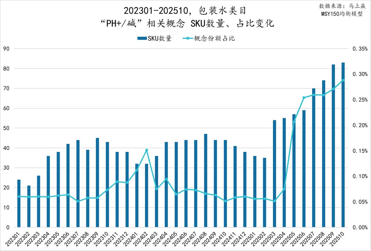 尽管碱性饮食的概念一直备受争议,但在过去一年,跟“PH+/碱”相关的饮用水SKU数量明显上升,并且市场份额也有大幅度的增长。虽然品牌方在广告法的限制下推广内容受限,但在社交媒体上,碱性水与健康、长寿甚至生育的功能性联想,激发了消费者对这一概念饮用水的追捧。这种社交媒体上的讨论和消费者口碑推动了碱性饮用水的市场需求,并促使相关产品的市场份额不断攀升,在今年获得了大幅的增长。