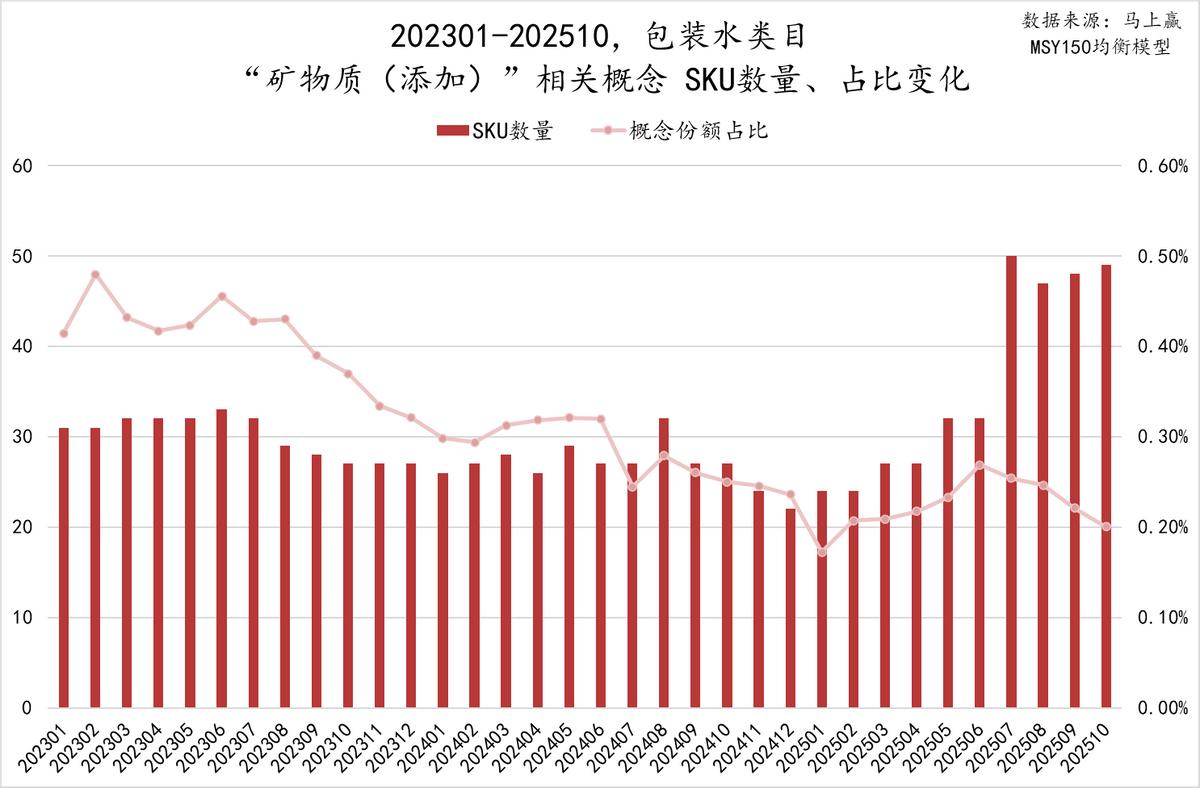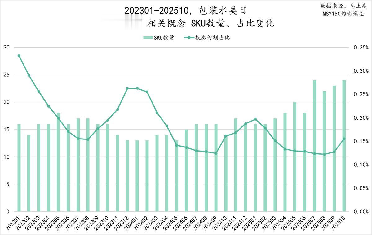元素添加概念相关的产品,SKU数量呈现出较为明显的上升趋势,占比亦有略微上升的趋势。去年农夫山泉创始人在媒体活动上,以自身选择小小的带火了一把“锂水”,究其根本则是消费者对于针对性的功能性、功效型添加,依然有着相信与认可,随着功效化功能化产品的浪潮,未来该类型产品或将迎来更大的发展。