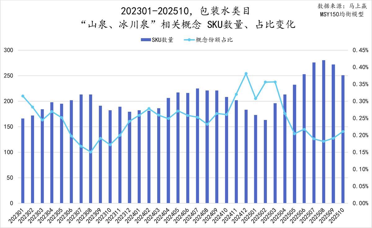 “山泉、冰川泉”概念产品是指产品名称或产品宣称中包含“山泉水”、“冰川泉水”的包装水产品,但不包含集团/品牌名中有该字段的非类似宣称产品。需要注意的是,虽然以山泉、冰川泉概念为主推,但其产品并非全部为矿泉水,亦包含常规的纯净水或天然水等水种产品。