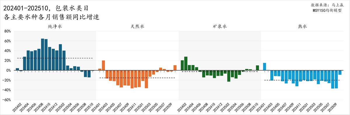 从销售额同比增速的角度来看,不同水种的市场表现差异明显。纯净水在2024年大部分时间都实现了超过20%的销售额同比增速,增长势头非常强劲。然而,进入2025年后,纯净水的销售额同比增速明显收窄,甚至在部分月份出现了下滑,其快速增长的势能或已逐渐消退。