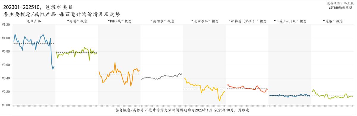 进一步来看,不同饮用水概念/来源的价格走势存在显著差异。受限于运费、关税等原因,进口产品的价格远高于其他概念,达到了约0.9元每百毫升,但在近期出现了较为显著的下滑;其次是“母婴”概念的水产品,体现了其在市场中的高端定位和细分人群的附加值;“PH+/碱”概念、“蒸馏水”概念的产品其每百毫升均价也高于包装水类目每百毫升均价约30%,体现了有益添加、不同工艺的溢价能力;“元素添加”、“矿物质(添加)”、“山泉/冰川泉”、“泡茶”百年水产品则没有太多溢价,甚至部分略低于包装水每百毫升均价。