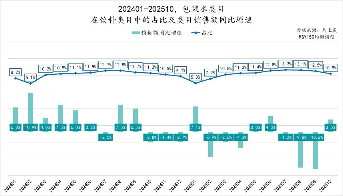 可以看到,2025年同比2024年,包装水在饮料类目中的占比呈现轻微上升趋势,在夏季旺季时占比超过了13%。然而,从销售额同比增速来看,2024年包装水的销售额同比增速在多数月份保持正增长;但到了2025年,除了春节错位带来的短期波动外,包装水的销售额同比增速在多个月份为负,尤其是在8月、9月,包装水的销售额同比增速接近-10%,下滑显著。