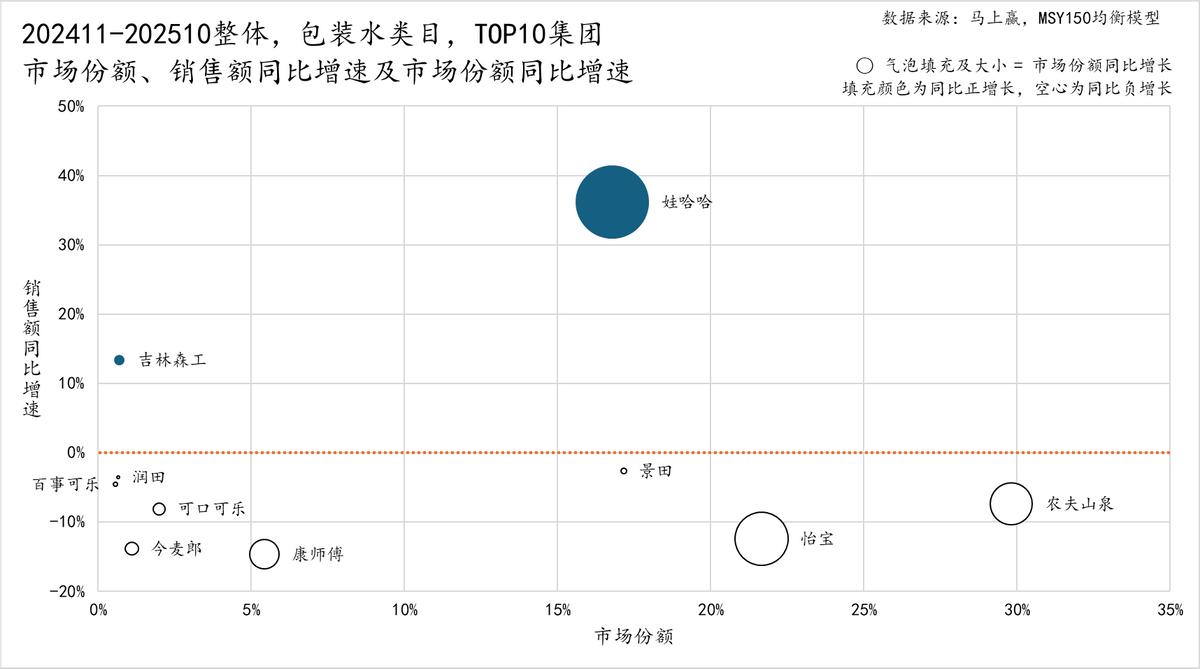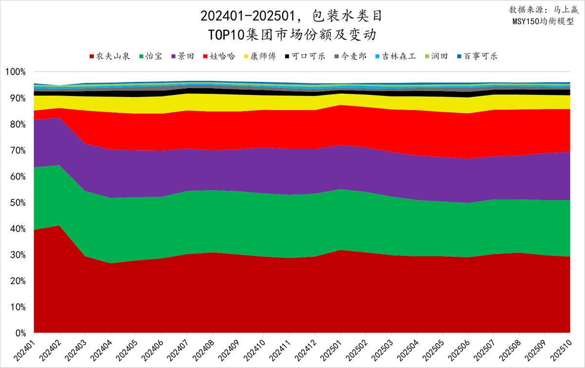 将时间拉长到2024年以来,纵观整个事件对包装水类目TOP10集团市场份额影响的全貌: