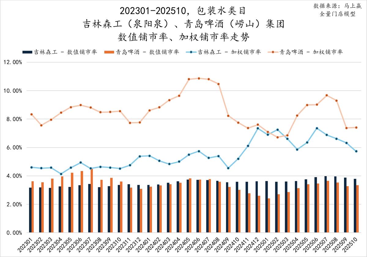 从铺市率的角度看,青岛啤酒的数值铺市率波动较为明显,但整体有一定的下降趋势,相比来说吉林森工的数值铺市率则较为稳定,且呈现一定的轻微上升趋势;加权铺市率上,吉林森工虽然整体低于青岛啤酒,但两者的差距正在不断减小,甚至在2025年年初时有个别月出现了接近于反超。