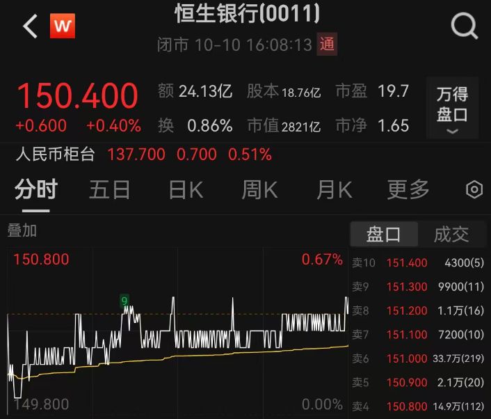 公告显示,这一价格较恒生银行近期股价溢价超30%。市场对此反应迅速,上述公告发布后,恒生银行股价两日累计上涨超25%,截至10月10日收盘报150.4港元/股。